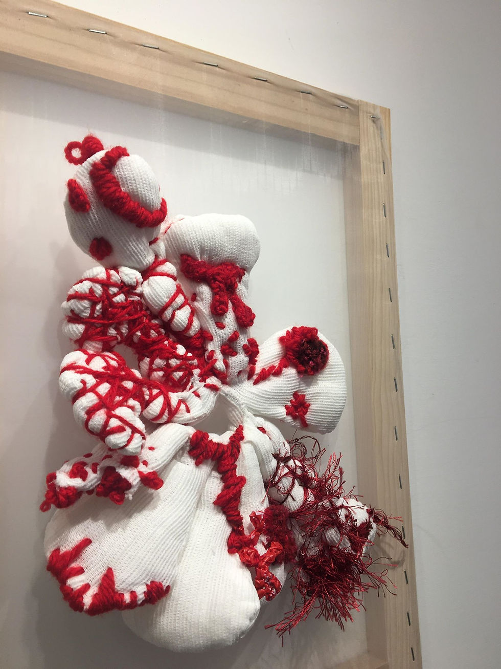 以雙手作為穿戴的場域,紅色的線象徵她的傷,卻也是她對手作的熱愛,想像從她的手脈中,生根、長出花朵。軟別針以十指做抽象化的設計,每根手指遍佈傷痕、血痕與血珠,然而這樣的痛,在觸覺上卻是柔軟與毛絨的療癒存在,這種衝突感將「疼痛中創作出的美」視覺化了。