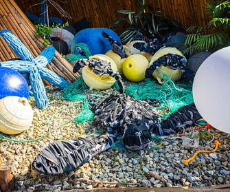 Since 2022, Yang Fang-Yi from #NotWaste Intervillage Lab and Lin Jun-Zuo from #WireTwister have been co-creating a series of works inspired by #Nature, continuing their regenerative art style. They use collected recycled plastics, weaving them into various forms of marine life through a wrapping technique. The garden is reimagined as an ocean: the grassy zone becomes the sea, the central bamboo-wood area transforms into a beach, and the distant floral trellis becomes the shoreline.
